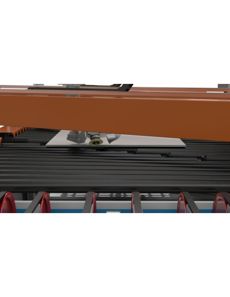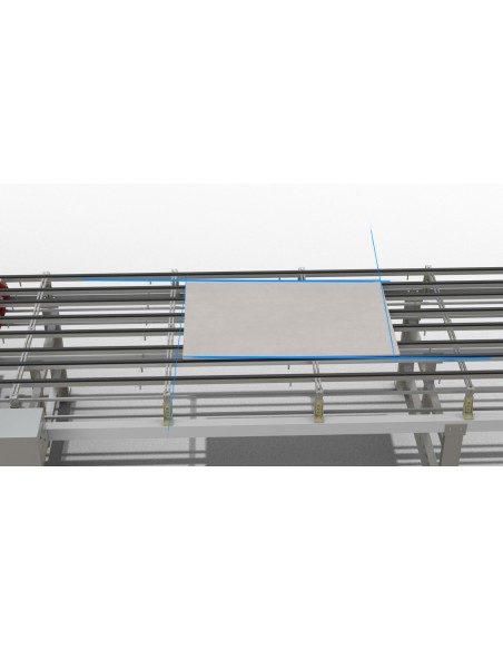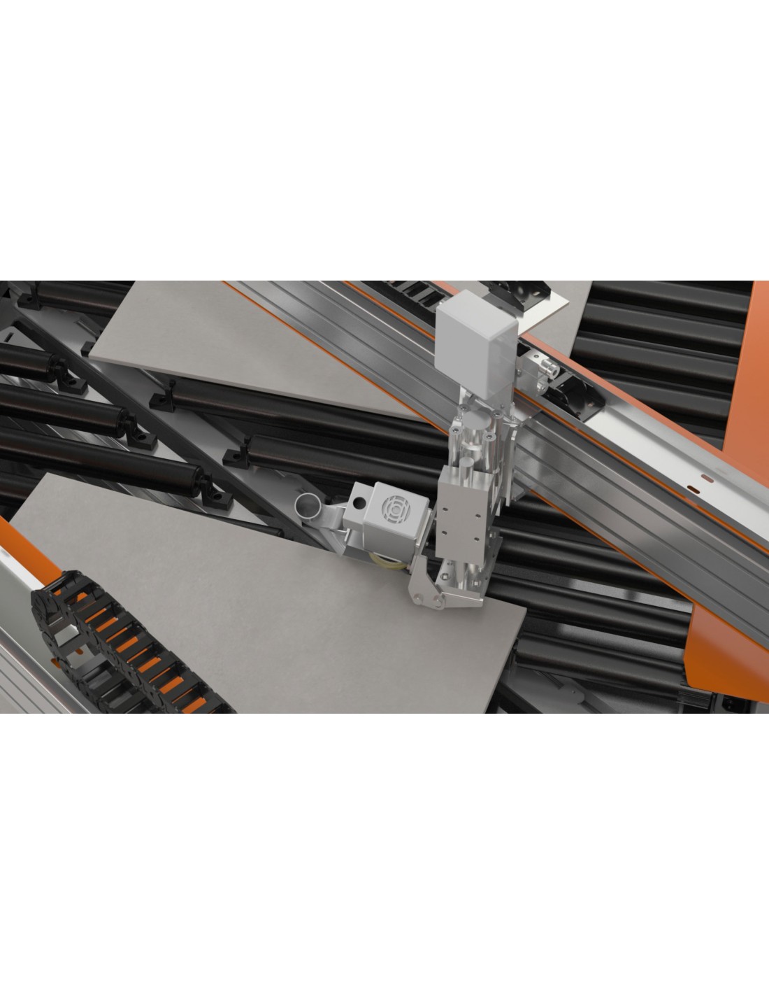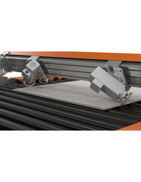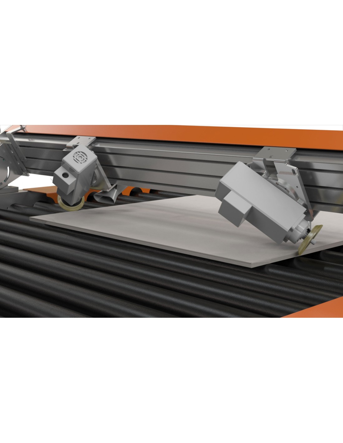 What makes this system unique is its deburring heads, which automatically adapts to the slab or tile. Photoelectric sensors detects the angle and position, relaying the data to the PLC, which adjusts the head position before deburring.