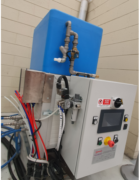 CIRCUITO LAVAGGIO CON ATTUATORE PNEUMATICO, RETE IDRAULICA INTERNO CABINA ED UGELLI A BASSA PRESSIONE PER LAVAGGIO ZONA ASPIRANTE