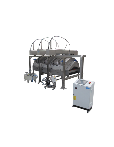 STAZIONE AIRLESS MULTIASSE 4.0 CON TRASLATORI INDIPENDENTI PER APPLICAZIONE SMALTI, INGOBBI, CRISTALLINA E APPLICAZIONE DI PROTEZIONE FINALE PER LASTRE FINO A 2200 mm ADATTA A RICEVERE N°6 AEROGRAFI CON REGOLAZIONE ASSIALE INDIPENDENTE CON SPRUZZATURA SOLO IN PRESENZA DELLA LASTRA